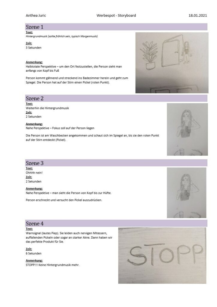 Am Ende des Jahres haben wir uns vermehrt den Medien und der Praxis zugewandt und anhand eines Storyboards einen Werbespot erstellt. Die erste Aufgabe war es, sich eine Werbung zu überlegen und mithilfe eines Storyboards aufzuzeichnen.