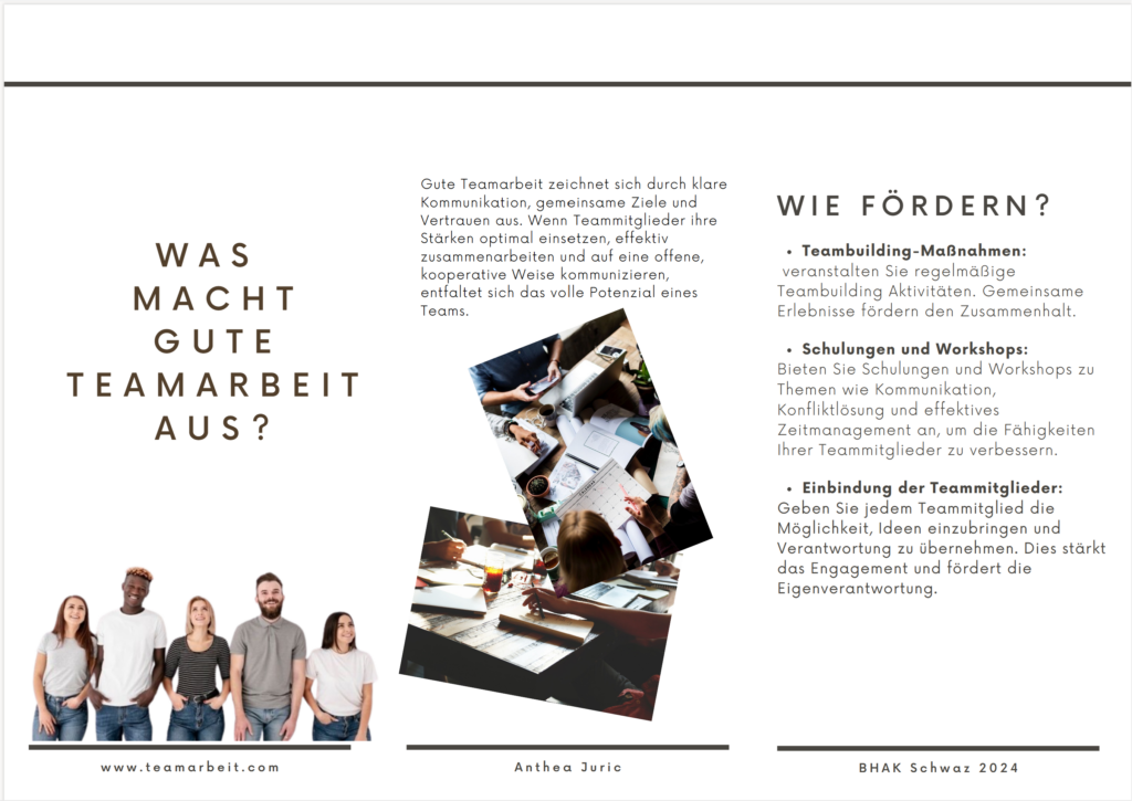 Aufgabe: Was macht gute Teamarbeit aus? Kriterien! Wie kann man Teamarbeit fördern? Gestalte ein Flyer mit den wichtigsten Informationen.
