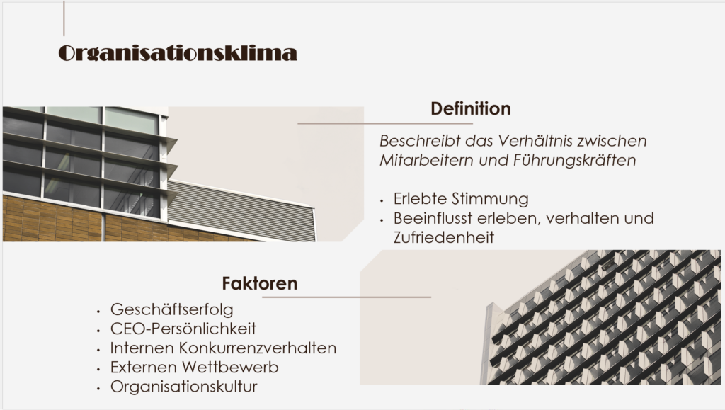 Das Organisationsklima beschreibt die allgemeine Stimmung und Atmosphäre innerhalb der Organisation, einschließlich der Mitarbeiterzufriedenheit, Kommunikationseffektivität und Arbeitsmotivation.